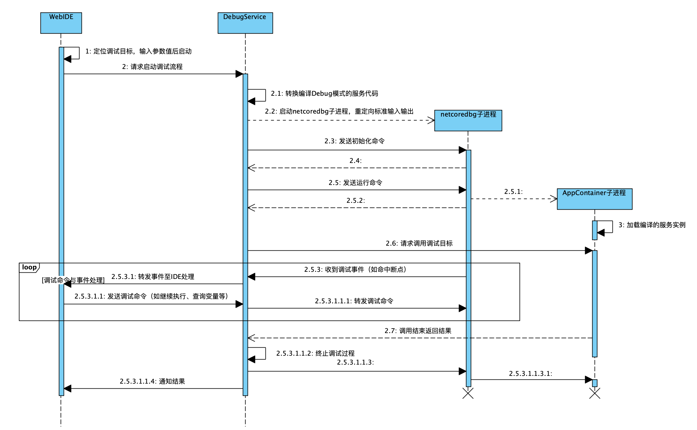 - 服务端DebugService收到调试请求后转换并编译Debug版本的服务代码,然后启动netcoredbg子进程(需要重定向标准输入输出,netcoredbg通过标准输入输出接收调试指令并响应),初始化调试子进程后发送运行命令启动AppContainer子进程,AppContainer子进程在启动时加载已编译好的目标服务实例并注入容器内;