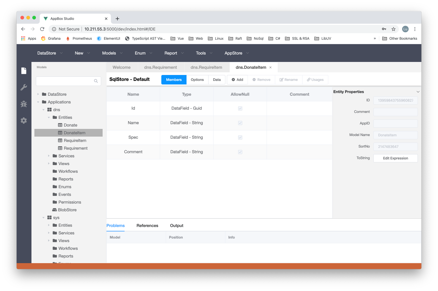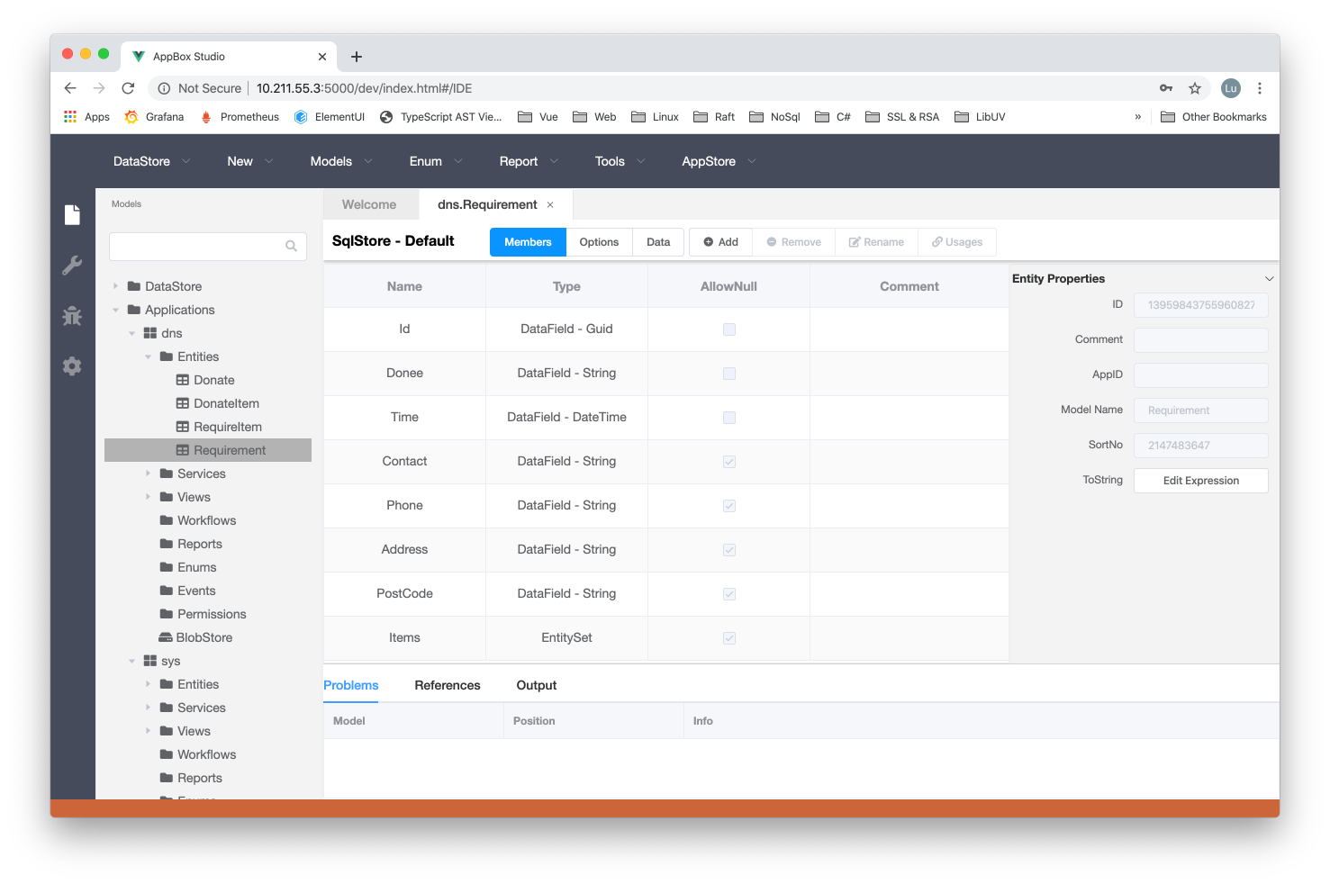 示例所采用的数据结构为“物资需求”一对多“物资清单”,通过IDE的实体设计器如下所示: