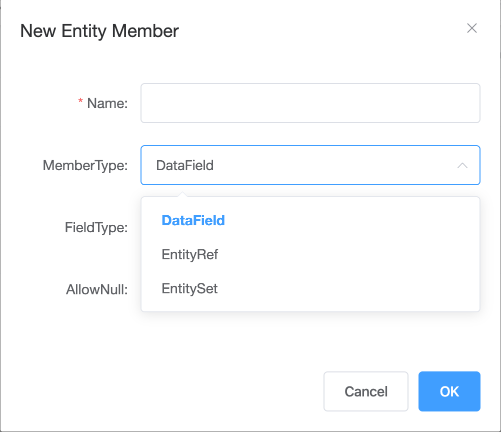 添加实体成员时选择类型EntityRef(一对一)或EntitySet(一对多)可设置相应的导航属性