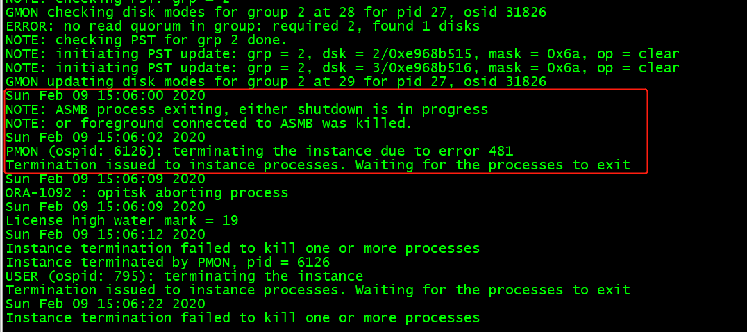 从数据库告警日志可以发现,核心进程asmb 在2.9日15.06分 突然提示正在终止,随后一节点数据库报错,不能与 ASM通信, 也就是连不上 ASM存储,检查ASM告警日志发现,核心进程ASMB 在2.9日15.06分 被kill 掉,随后一节点的ASM实例挂掉,导致一节点数据库也紧跟着挂掉