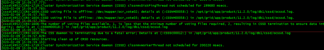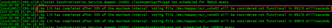 一节点开始报 voting file所在的磁盘,IO通信有超时的现象,磁盘hang住, 到15.05分开始 ocr_vote磁盘离线,一节点被剔出集群,