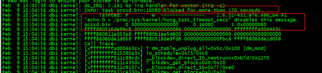后续检查主机,发现主机重启过,检查操作系统日志,发现从15.02分开始,: INFO: task ocssd.bin:16080 blocked for more than 120 seconds. 有任务被hung 住,