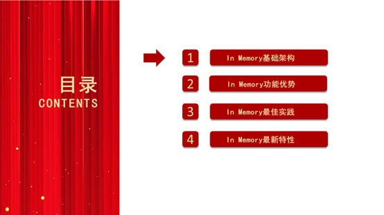 本文从四个方面介绍In Memory,首先是其基础架构,然后介绍性能优势和特性,接着是其使用场景和最佳实践,最后介绍20c中的最新特性。