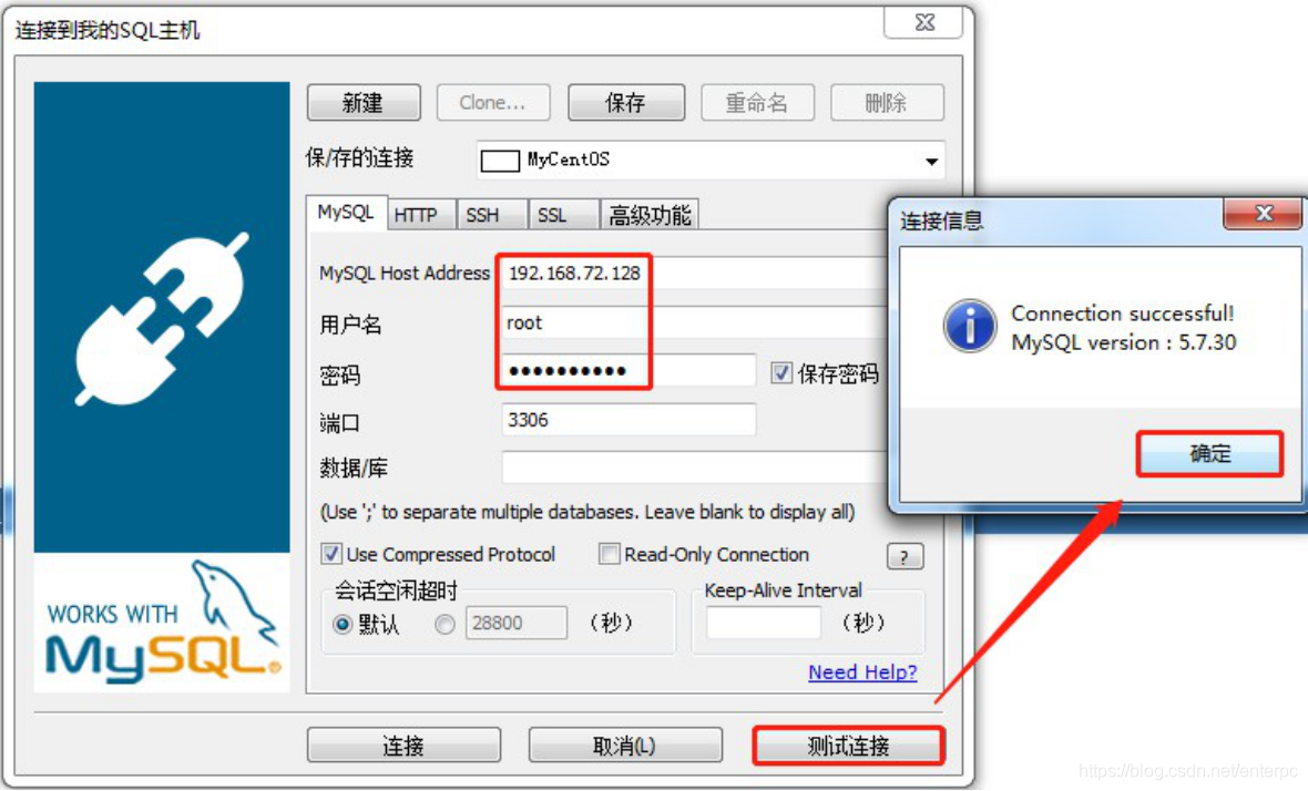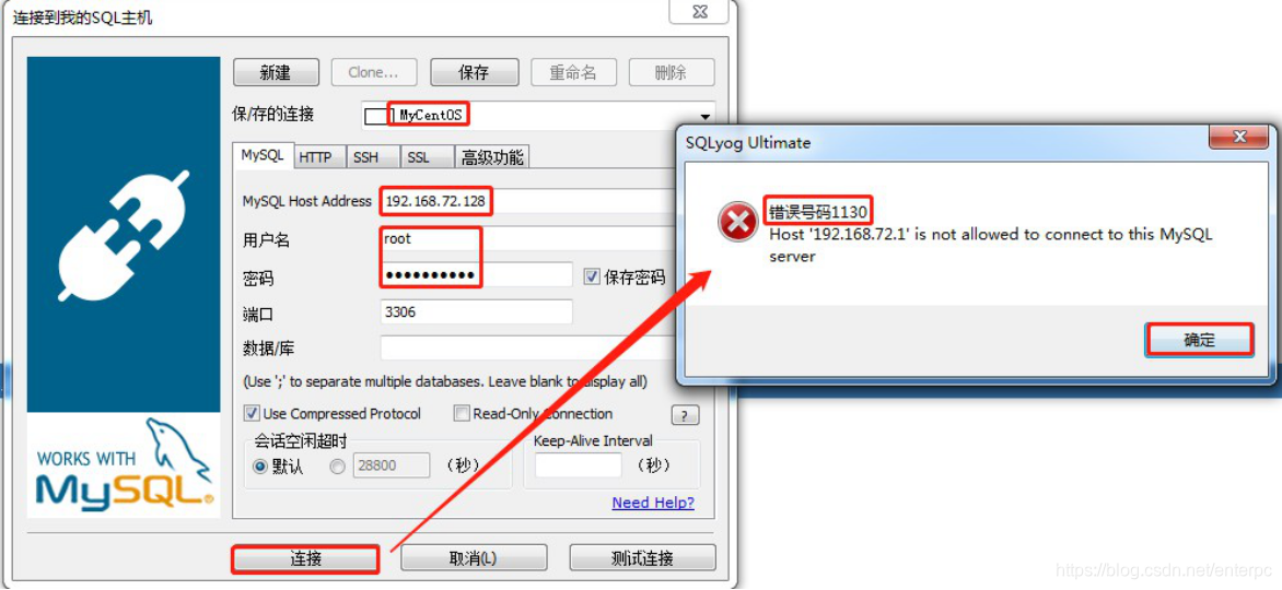 - 启动图形化界面工具SQLyog连接虚拟机中Mysql数据库,如下图: