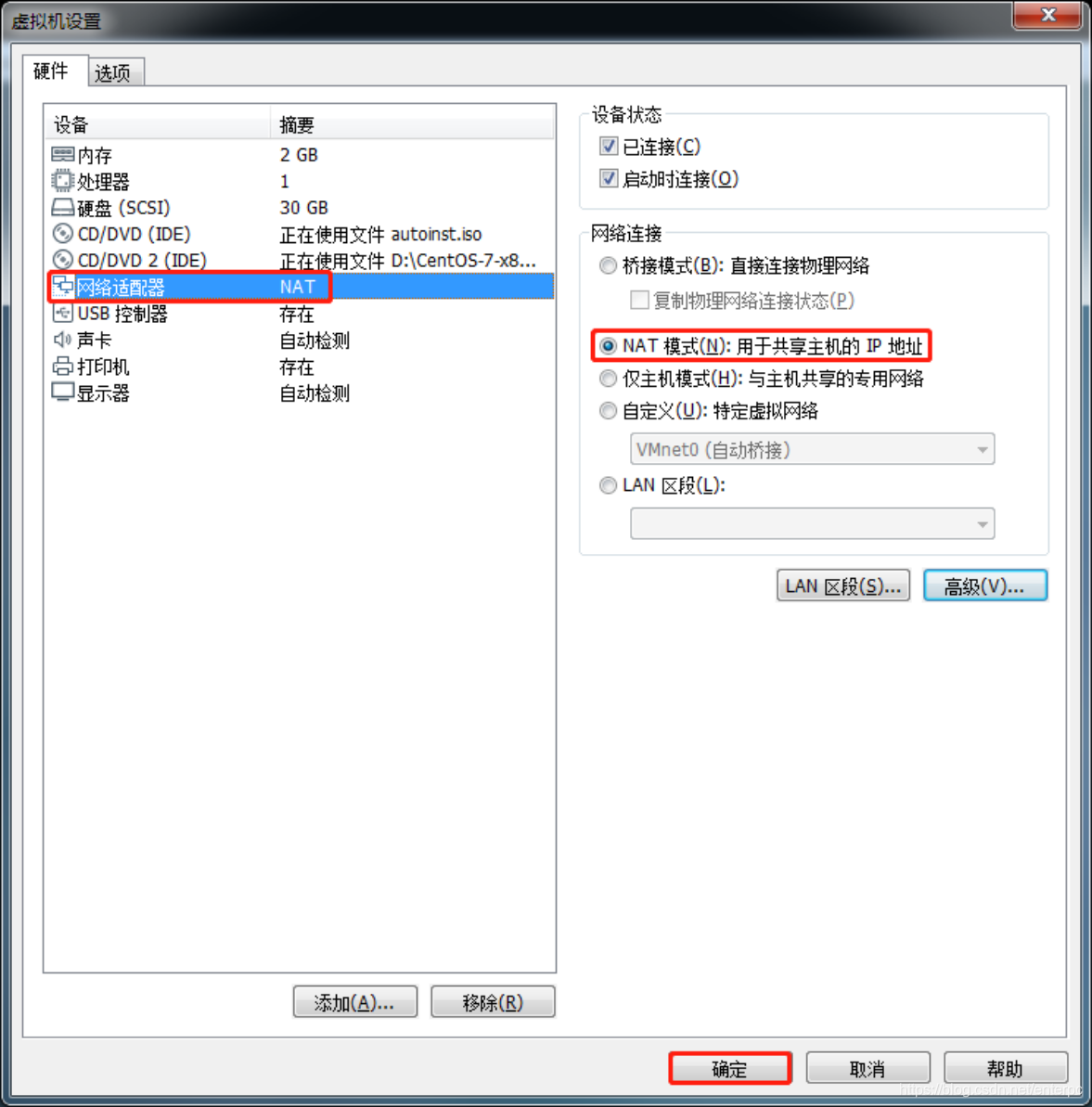 - 设置网络连接模式为NAT模式,如下图: