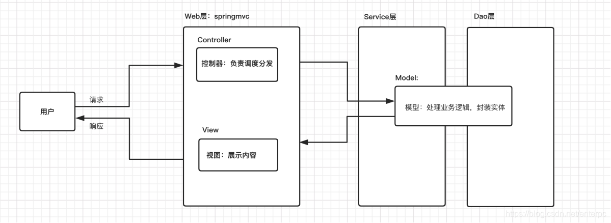 - C(controller)控制器:负责调度分发(1.接收请求、2.调用模型、3.转发到视图)