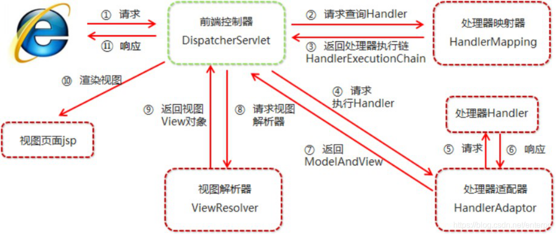 - HandlerAdapter将controller执行结果ModelAndView返回给DispatcherServlet。