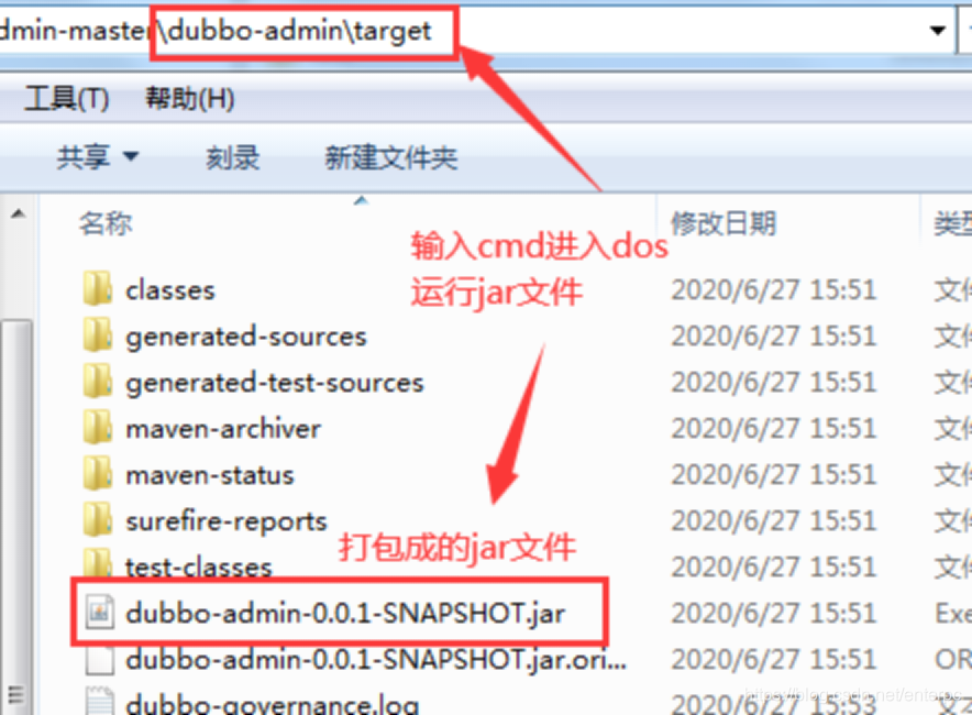 在dos下运行target目录中的jar文件:java -jar dubbo-admin-0.0.1- SNAPSHOT.jar