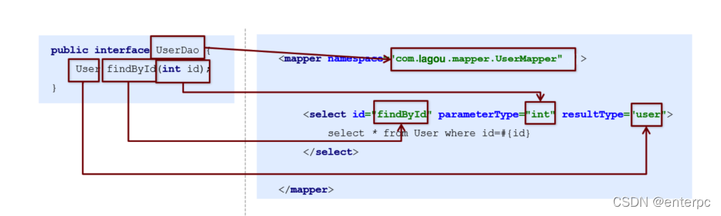 3) Mapper接⼝⽅法的输⼊参数类型和mapper.xml中定义的每个sql的parameterType的类型相同