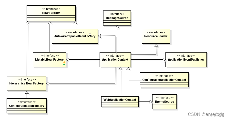 通过其接⼝设计,我们可以看到我们⼀贯使⽤的 ApplicationContext 除了继承BeanFactory的⼦接⼝,还继承了ResourceLoader、MessageSource等接⼝,因此其提供的功能也就更丰富了。