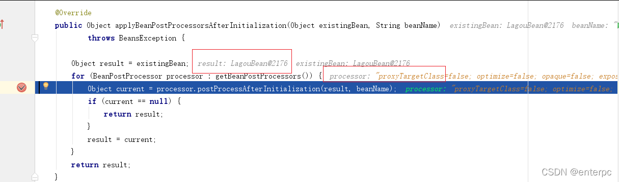 Object current = processor.postProcessAfterInitialization(result, beanName);