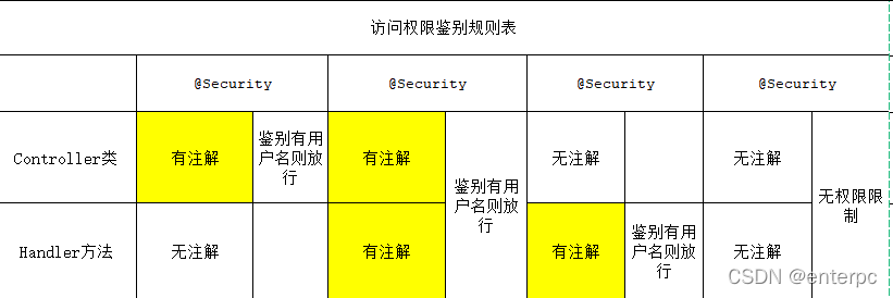 (二) 权限鉴别的注解注解@Security,可以放到某个Controller类上,也可以放到某个Handler方法上,也可以哪里都不放。具体鉴权规则如下: