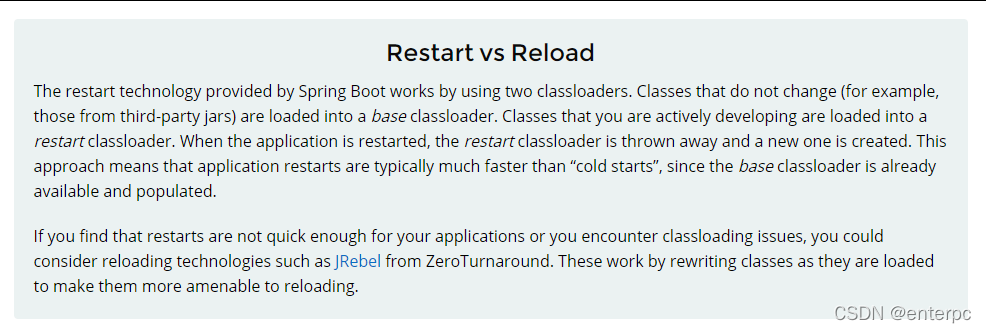 这里提到了,该插件重启快速的原因:这里对类加载采用了两种类加载器,对于第三方jar包采用baseclassloader来加载,对于开发人员自己开发的代码则使用restartClassLoader来进行加载,这使得比停 掉服务重启要快的多,因为使用插件只是重启开发人员编写的代码部分。