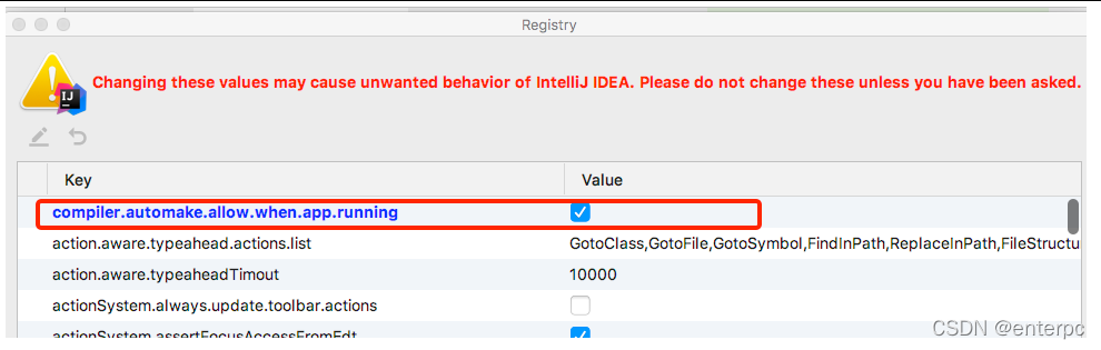 列表中找到“compiler.automake.allow.when.app.running”,将该选项后的Value值勾选,用于指