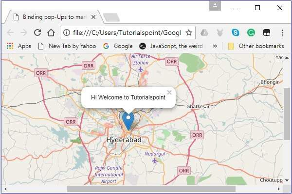 marker.bindPopup('Hi Welcome to Tutorialspoint').openPopup();