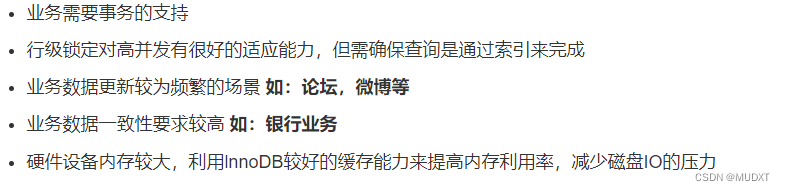 支持事务处理、外键约束、占用空间比MyISAM大,适用于需要事务处理、更新删除频繁的应用场景