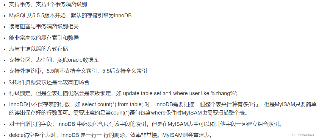 InnoBD支持:事务、mvcc、聚簇索引、外键、缓冲区、AHI、DW;MyISAM均不支持