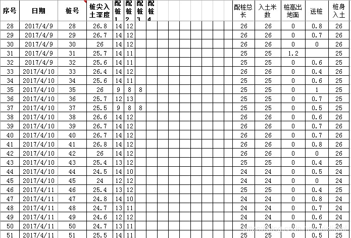 2、提取管桩配桩、高出地面、送桩和入土深度数据
