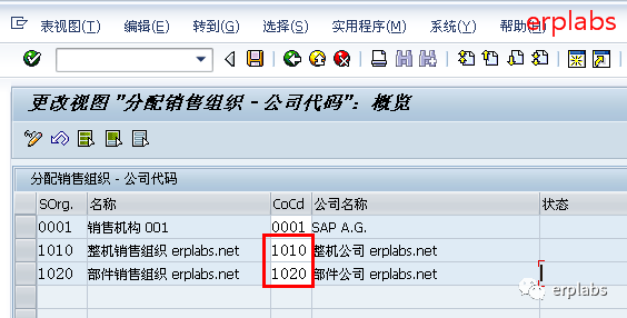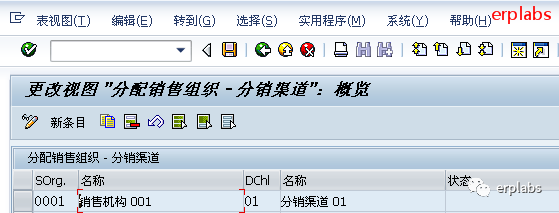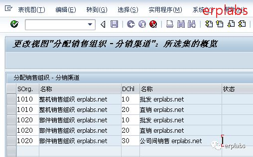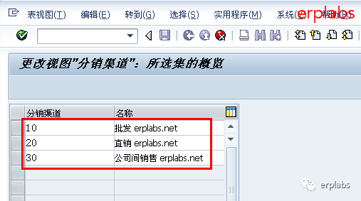 输入销售组织1010对应10、20销售渠道,1020对应10、20、30销售渠道,其中1020组织有30公司间销售渠道,保存。