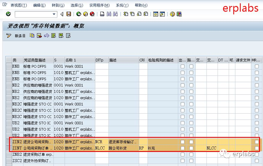 STO公司间采购订单类型ZINT,使用的交货类型为NLCC跨公司补货,可用性检查输入RP补充,交货类型2列也要维护为NLCC。公司间退货采购订单ZIN2,使用交货类型为NCR,保存。