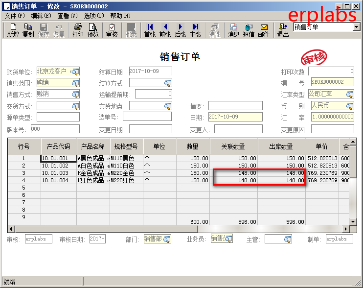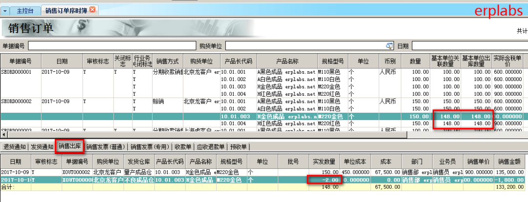 前步退货后,再来查询显示销售订单,查看出库数量变化。