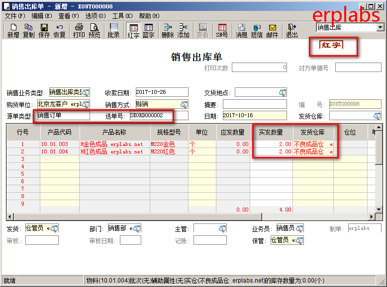 如上图,源单类型选“销售订单”,选单号框双击弹出选择订单及对应产品,带回单据单体界面,修改实退数量2个、发货仓库“不良成品仓”,保存审核。