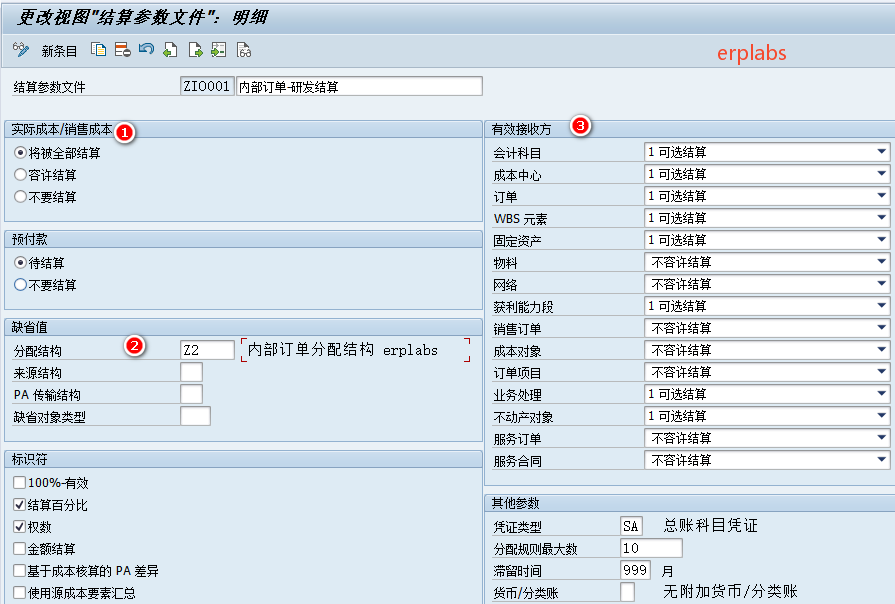 统计型内部订单不能进行结算,实际型内部订单月末一般结算到其它成本对象,例如本案例研发项目订单研发费用,费用化结算到研发费用(期间费用),这里定义内部订单的结算参数文件。
