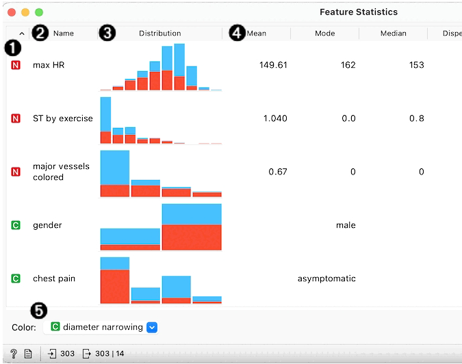 在心脏病数据集上使用特征统计小部件的示例。