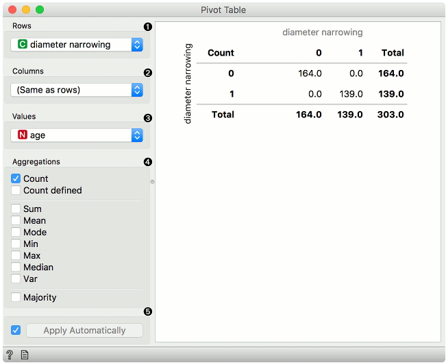 数据透视表将大型数据表汇总为统计表。统计方法包括求和、平均值、计数等。该部件还允许从表中选择子集并按行值(必须是离散变量)进行分组。仅含数值变量的数据无法在表中显示。