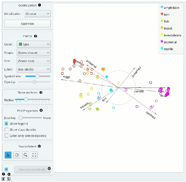 FreeViz 采用了一种借鉴自粒子物理学的范式:同类数据点相互吸引,不同类数据点相互排斥,产生的力作用于各维度的属性锚点(即每个坐标轴的单位向量)。数据点无法移动(已被投影到投影空间),但属性锚点可以移动。优化过程采用爬山算法,最终使锚点达到受力平衡状态。点击 优化 按钮可启动优化过程。优化的结果可能取决于锚点的初始位置(可设置为圆形、随机或手动调整)。手动调整功能在优化过程中随时可用,建议通过此功能观察锚点位置变化对数据点投影的影响。