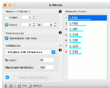 该组件使用k均值聚类算法处理数据,并输出一个新增了聚类标签(元属性)的数据集。组件中会展示不同k值下聚类结果的轮廓系数。若启用轮廓系数选项,分数越高表示聚类效果越好。
