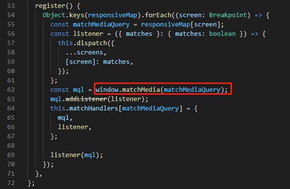 这里主要看一下注册的方法,是调用了matchMedia方法,然后匹配不通的媒体查询条件