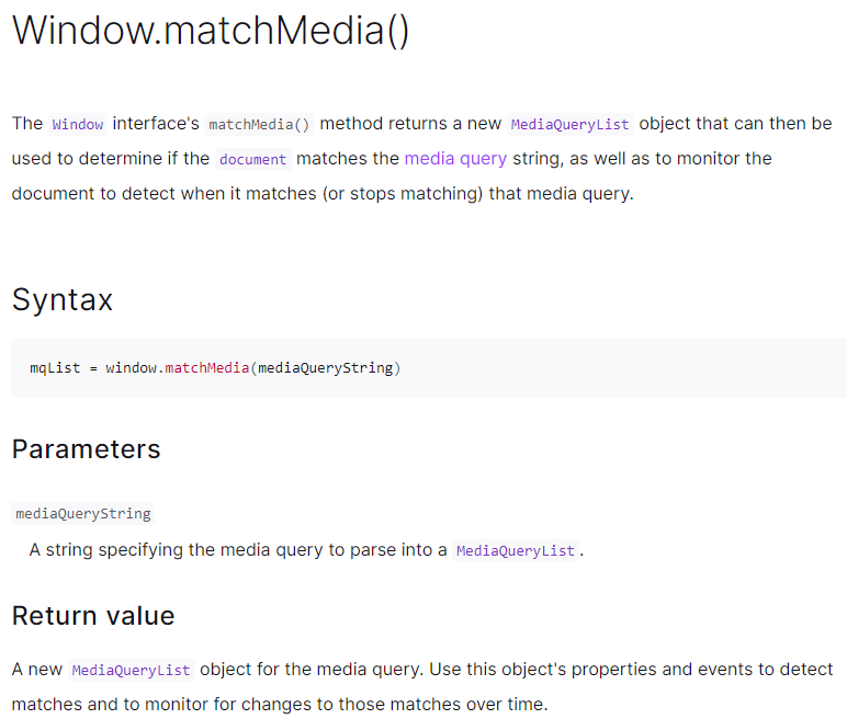 所以可以看下MDN的用法,也是很简单,匹配媒体查询的字符串,然后监听变化就可以了。