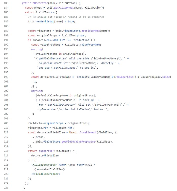 这里去看一下rc-form会比较清晰,找到引用的createBaseForm组件,再搜索到getFieldDecorator函数: