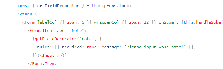 这里用的是getFieldDecorator方法,实现了类似vue中v-model的语法糖,劫持了onChange事件,赋值给实际对应的value。