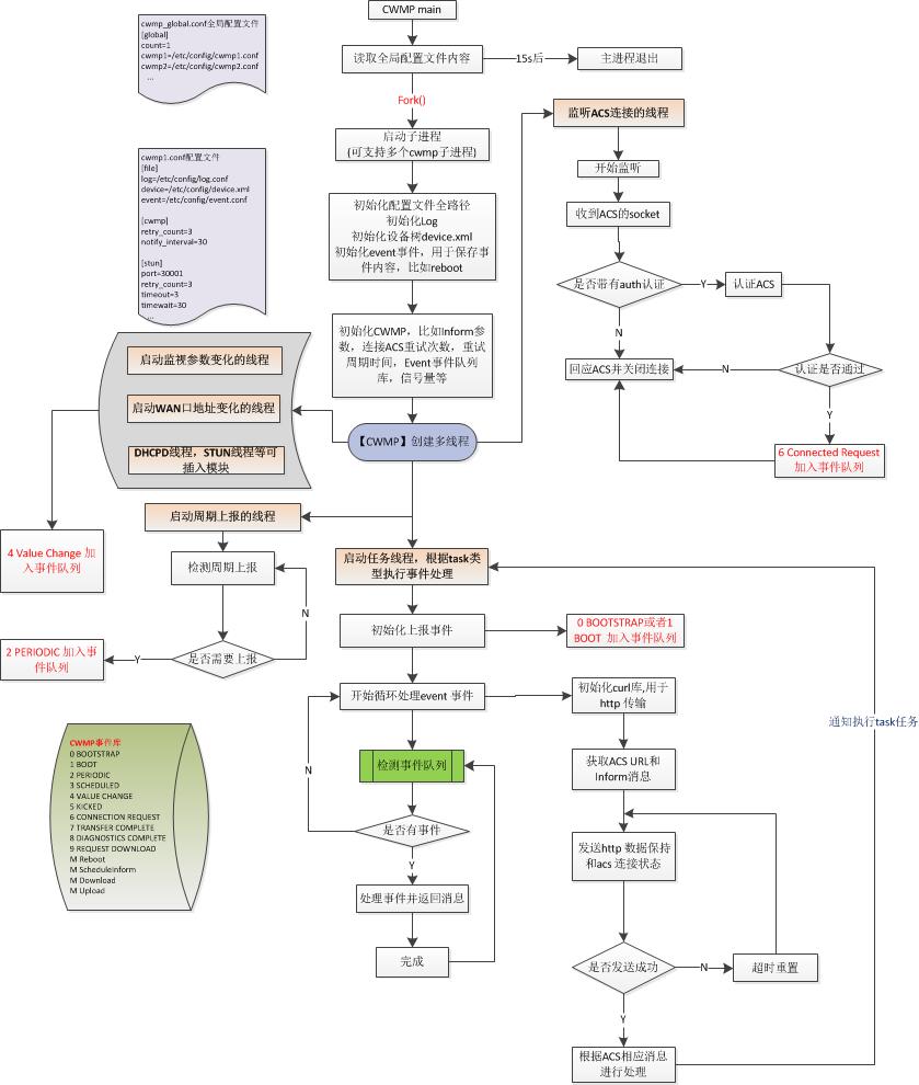 原则上,CWMP core的程序代码不需要修改,主要是根据客户的需求修正或者进行"插入式的"新增事件类型和模块化处理。而设备相关的程序,我们封装成了一个动态库(libcwmp.so),便于独立编译和维护开发。