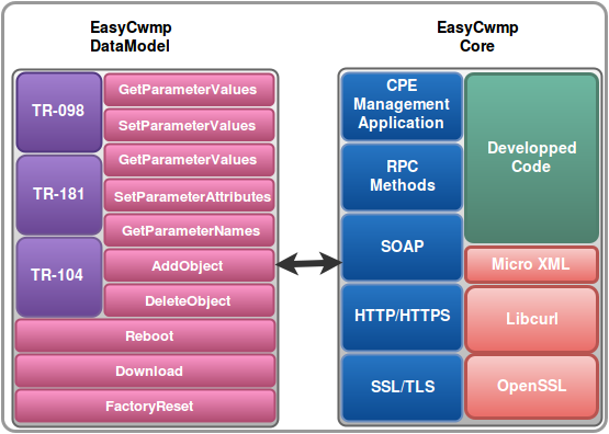 程序设计的思想来自于easycwmp官网,看过或者用过easycwmp的工程师应该都知道,该开源代码还有商业版,而且价格不菲。easycwmp官网如是说:DataModel is developped with shell as free solution and with C as commercial solution.。开源代码用来学习还是值得的,若是用于商业产品可能就会显得"力不从心"。幸运的是,我有机会阅读了Works Systems公司和broadcom公司的tr069代码,架构设计与easycwmp的设计"如出一辙",不知是谁抄袭了谁?下图是easycwmp官网的程序架构图。但是,个人对于Works Systems公司的代码"情有独钟"并且进行了重新开发和利用,使得程序更加高效易用和移植性。基于此,本文就着重介绍在商业代码中如何高效,便捷的实现DataModel 和CWMP core分离,给读者一个程序设计的思路。 后续若有机会可以介绍一下broadcom公司的程序设计仅供参考。本质上大同小异。