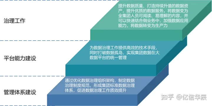 企业数据治理分为管理体系建设、平台能力建设及治理工作三部分。以管理体系为基础,数据治理平台为工具,推动数据治理工作顺利开展。
