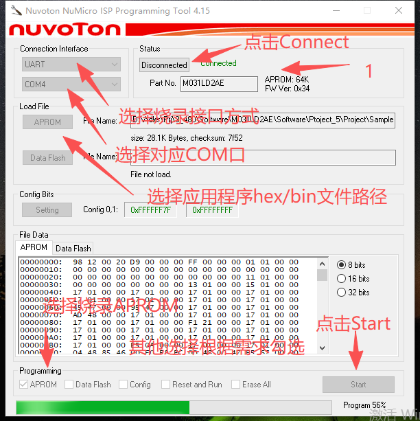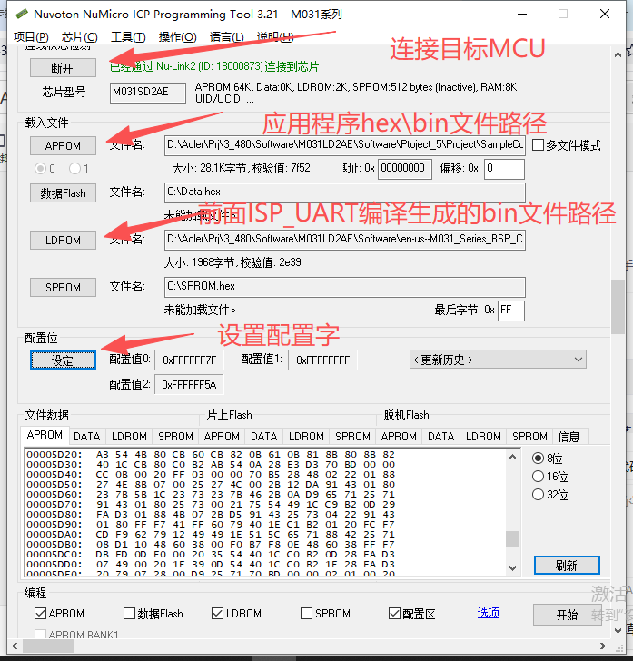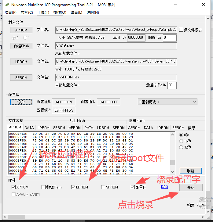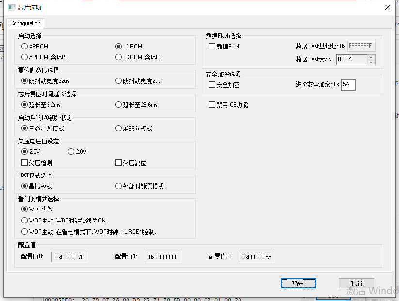 若只烧录LDROM 则不需要打勾APROM;配置字一般都需要打勾
