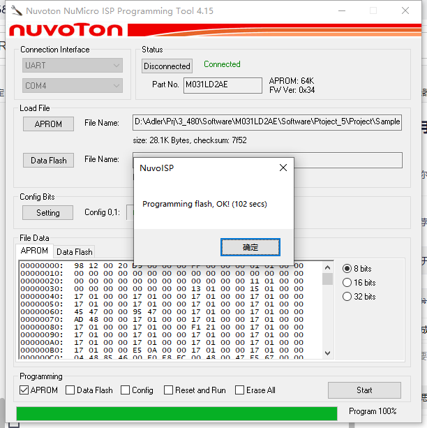 d.MCU信息读取成功后,添加应用程序固件并检查 Config下 0,1 配置位是否与上面截图中的数据一致,若不一致原因是ICP配置有误或烧录时未打勾配置区,反正向下进行