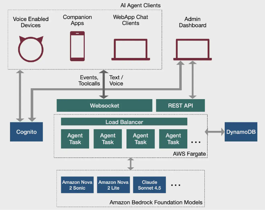 为物联网系统设计这样的智能体实现,需要充分考虑交互模式(文本、语音)、可扩展性、安全性、成本和安全风险。考虑到这些因素,Private AI Agents Platform 构建在 AWS 云服务之上,使用 AWS Fargate 作为主要应用平台,并以 Amazon Bedrock Foundation Models 作为后端 LLM 系统。乐鑫已提供公共试用实例;在生产环境中,客户可以将同样的平台部署到自己的 AWS 账户中。以下为系统的高层架构示意: