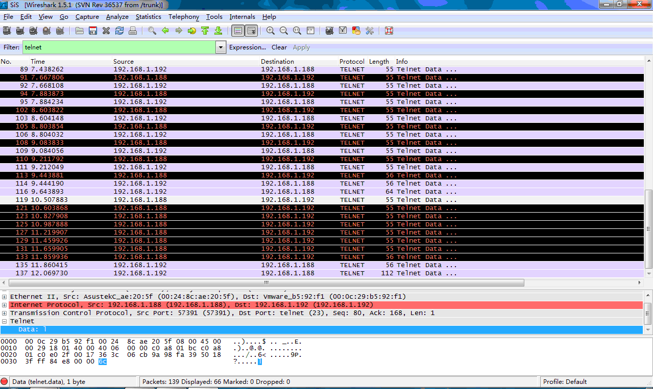 2、在DOS端通过TELNET登录linux主机(此时已经打开wireshark软件)