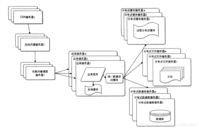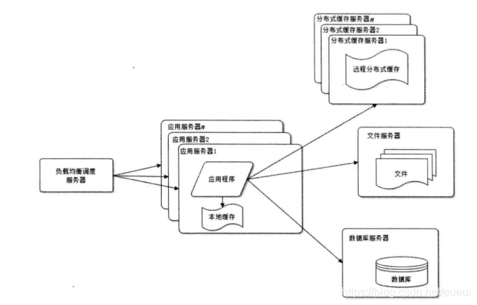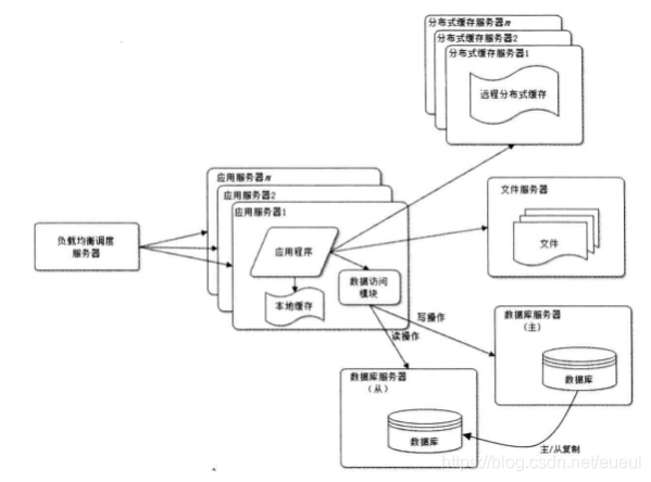 网站使用的缓存可以分为两种:缓存在应用服务器上的本地缓存和缓存在专门的分布式缓存服务器上的远程缓存。本地缓存的访问速度更快一些,但是受到应用服务器内存限制,其缓存数据量有限,而且会出现和应用程序争用内存的情况。远程分布式缓存可有使用集群的方式,部署大内存的服务器作为专门的缓存服务器,理论上做到不受内存容量限制的缓存服务。如图所示: