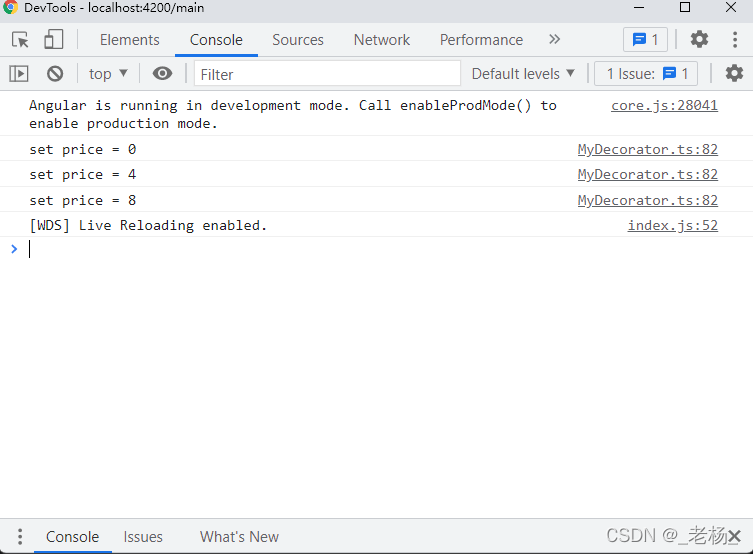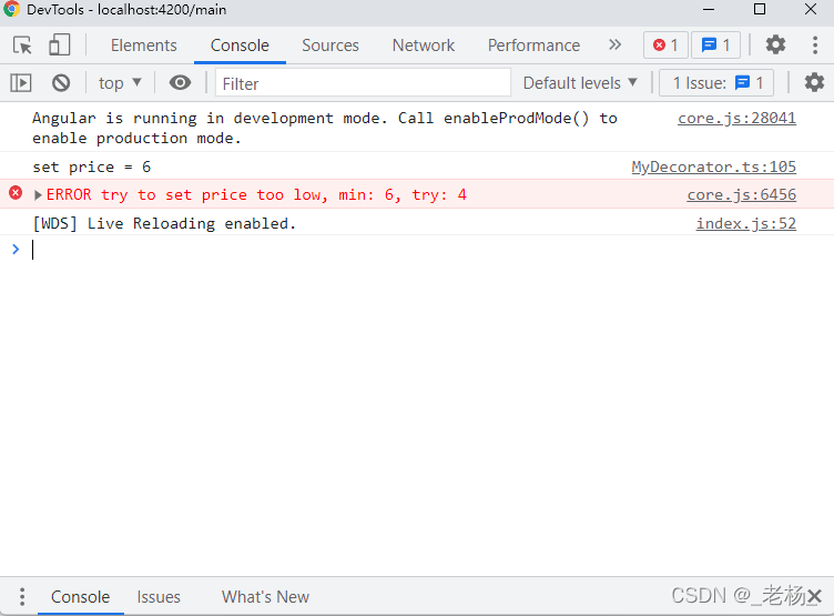以上示例 price 属性装饰器设置了最小值 6,在组件中调用 new Grape(4),小于了最小值,所以抛出了设置异常信息。
