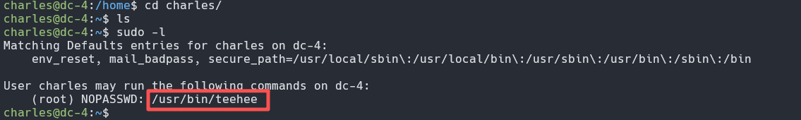 切换过去还是想着提权,sudo -l 看了一下 有一个teehee 应该可以利用一下