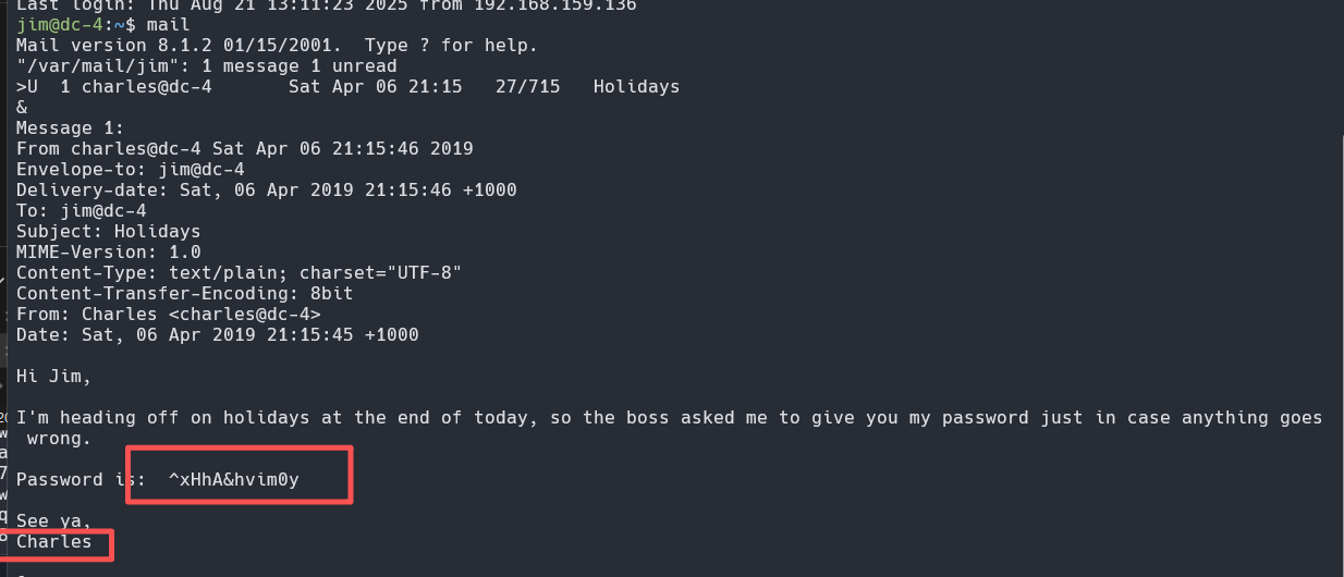 成功登录,登录后提示说有一个邮件,那就看看邮件内容吧