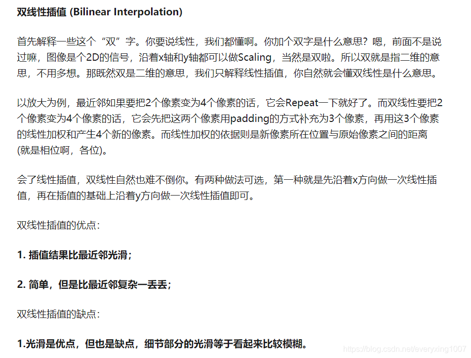 优点:当对相邻四个像素点采用双线性插值时,所得表面在邻域处是吻合的,但斜率不吻合。并且双线性灰度插值的平滑作用可能使得图像的细节产生退化,这种现象在进行图像放大时尤其明显。