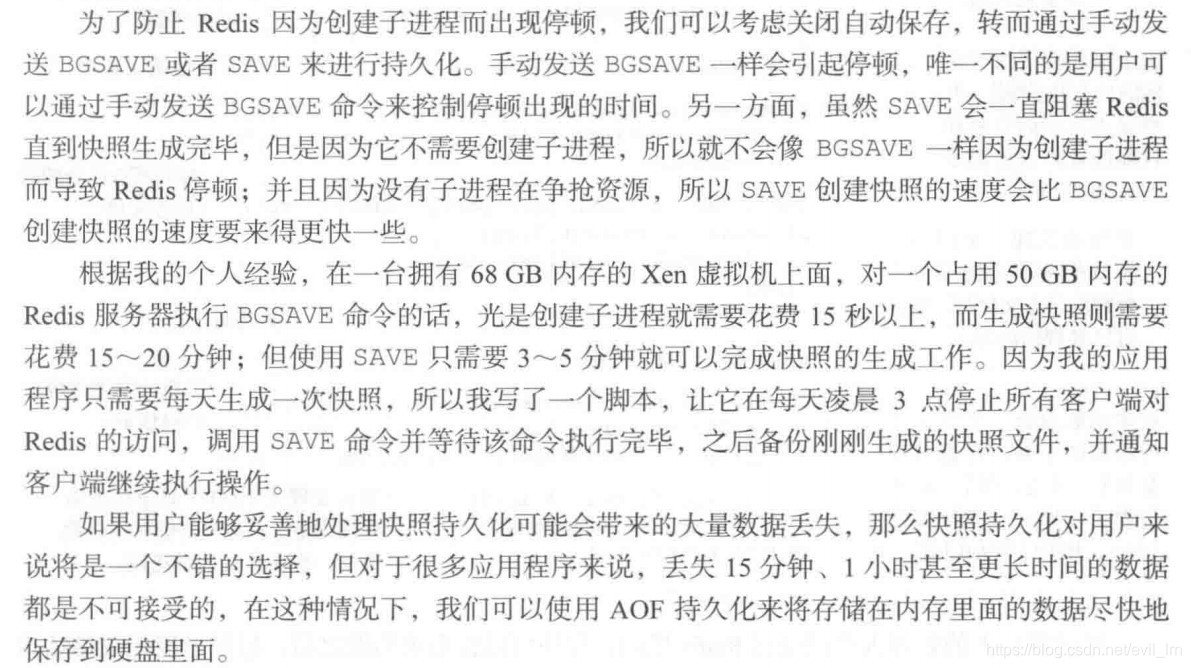 为了防止redis 因为创建子进程而出现停顿,可以考虑关闭自动保存,手动触发BGSAVE或者SAVE(SAVE命令 redis服务器再创建快照完毕之前不在相应任何其他命令)