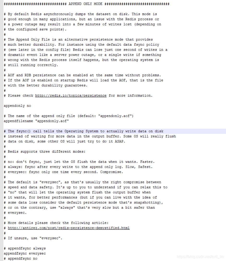 # appendfsync always //每次收到写命令就立即强制写入磁盘,最慢的,但是保证完全的持久化,不推荐使用