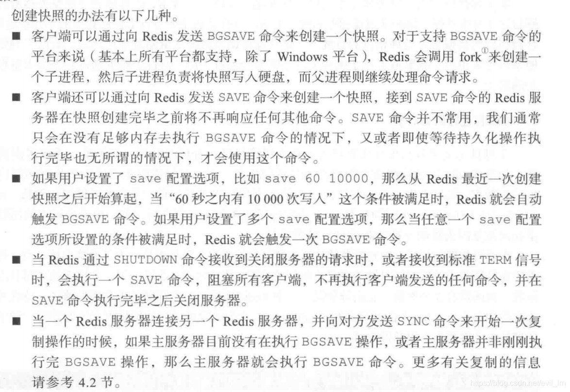 client 也可以使用save或者bgsave命令通知redis做一次快照持久化。save操作是在主线程中保存快照的,由于redis是用一个主线程来处理所有 client的请求,这种方式会阻塞所有client请求。所以不推荐使用。另一点需要注意的是,每次快照持久化都是将内存数据完整写入到磁盘一次,并不 是增量的只同步脏数据。如果数据量大的话,而且写操作比较多,必然会引起大量的磁盘io操作,可能会严重影响性能。